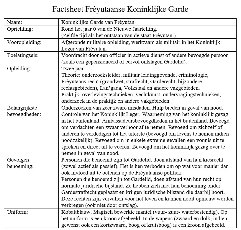 De achtergrond van mijn verhaalwereld wordt steeds uitgebreider. Een van de belangrijkste elementen in mijn verhalen is de Koninklijke Garde van Fréyutan.