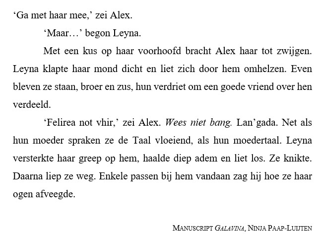 Vandaag trakteer ik jullie op twee mini-teasers! De titel – Galavina – betekent “Erfenis”. Ik wil geen spoilers weggeven, dat zou zonde zijn, dus ik ben voorzichtig met meer informatie. Maar je kunt alvast een piepkleine indruk krijgen met deze mini-teasers!