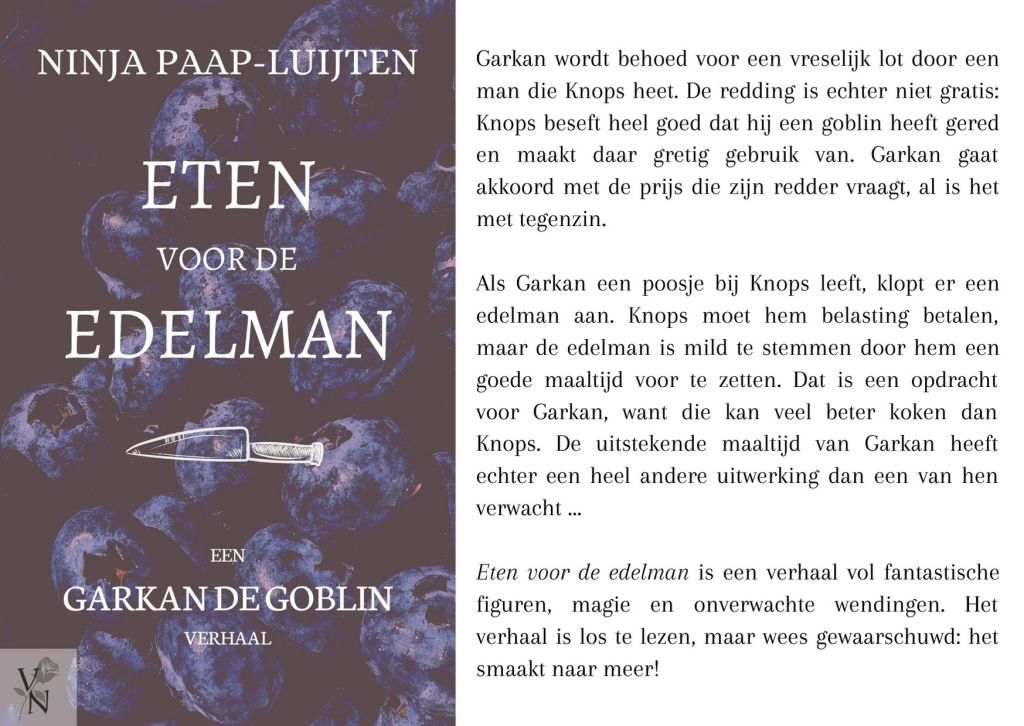 Mede dankzij de Facebookgroep Maxi mini bieb Aurora en een vriendin die iets had gepost over een kokende goblin, is dit verhaal tot stand gekomen. In Eten voor de edelman maak je kennis met Garkan en Knops, kom je terecht in een wereld die barst van de magie en natuurlijk zijn er weer de nodige verrassingen. Garkan de goblin is bovendien een bijzonder leuk personage om over te lezen!
