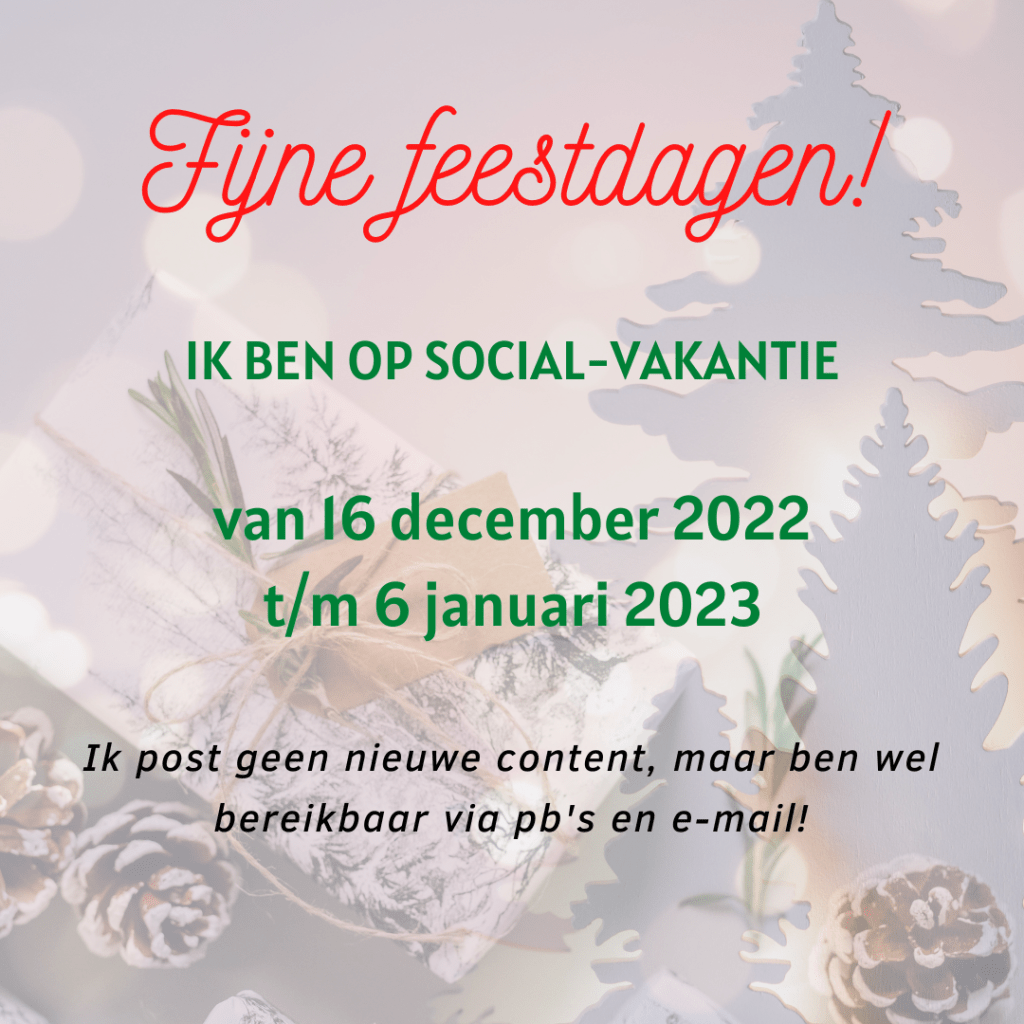 T/m 6 januari plaats ik even niets nieuws op de social media-kanalen. Ik ben er wel, dus als je mij een berichtje stuurt of ergens op reageert, zie ik dat en zal ik reageren. Je kan ook gewoon boeken bij me bestellen, mij vragen stellen of me e-mailen.