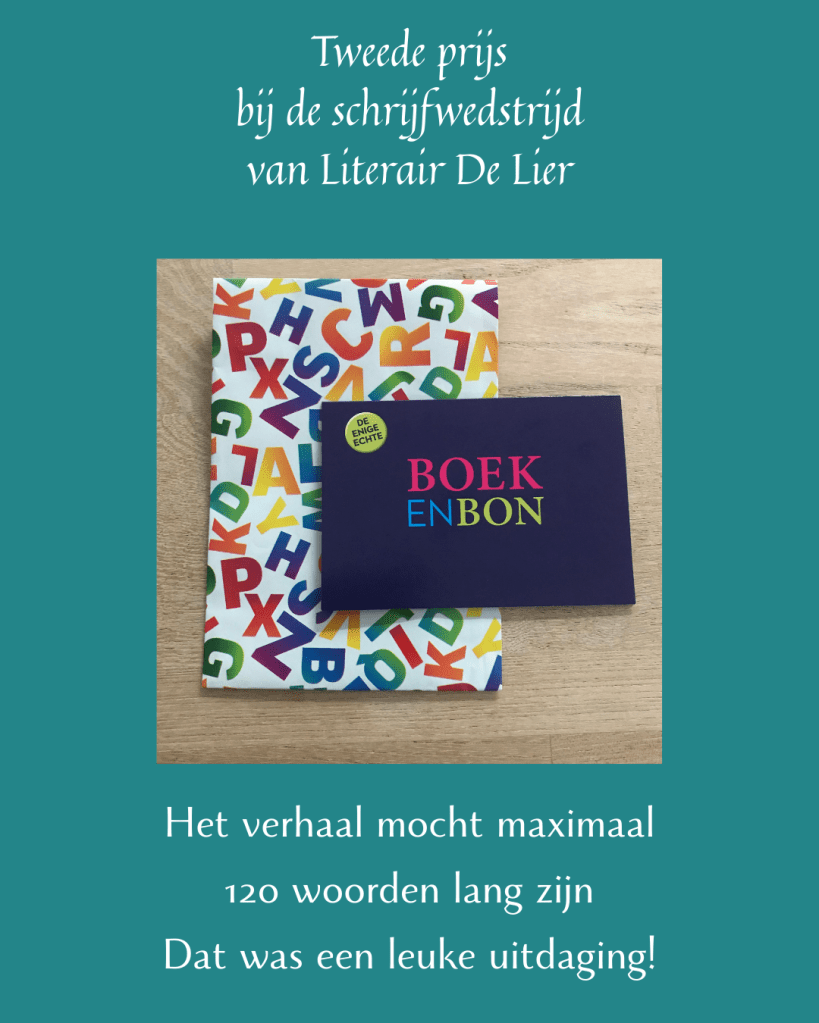 In het kader van de boekenweek deed ik mee aan de schrijfwedstrijd van de lokale schrijfvereniging Literair De Lier. Helaas kon ik zelf niet bij de avond zijn waarop alle winnaars bekend werden gemaakt. Maar ik kreeg een mailtje met leuk nieuws: ik was tweede geworden! En daar hoorde nog een prijs bij ook.
