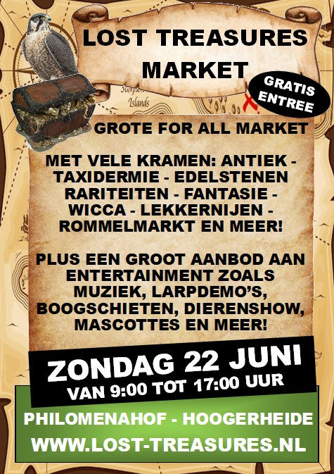 Zondag 22 juni kun je in Hoogerheide terecht voor de Lost Treasures markt. Er is van alles te beleven, de entree is gratis en je kunt er de hele dag vertoeven; het begint al om 9 uur en is pas om 17 uur afgelopen!